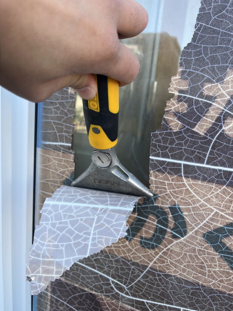 窓ガラスに貼っていた塩ビシートを専用の工具を使って剥がし、古いシートをきれいに取り除きます。