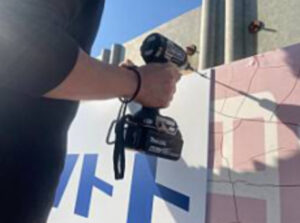 工場で製作したアルミ複合板に看板シートを貼り付け、現場で重ねて合わせてビスで固定する作業を行います。