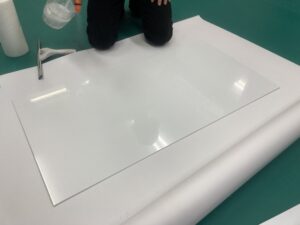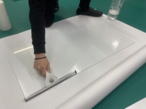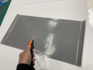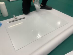 合わせて貼ったらスキージーで空気や水を抜くのですが印刷面に傷がつかないように表面に霧吹きをかけます。