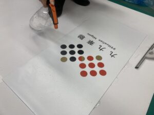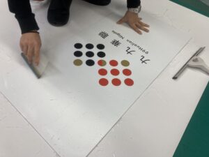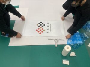 この非電飾シートの看板シートがw450×h900比較的小ぶりで黒帯の看板職人は一人で貼りますが、お客様が初めて貼る場合は2人でシートを合わせる作業をされる方がいいかと思います。