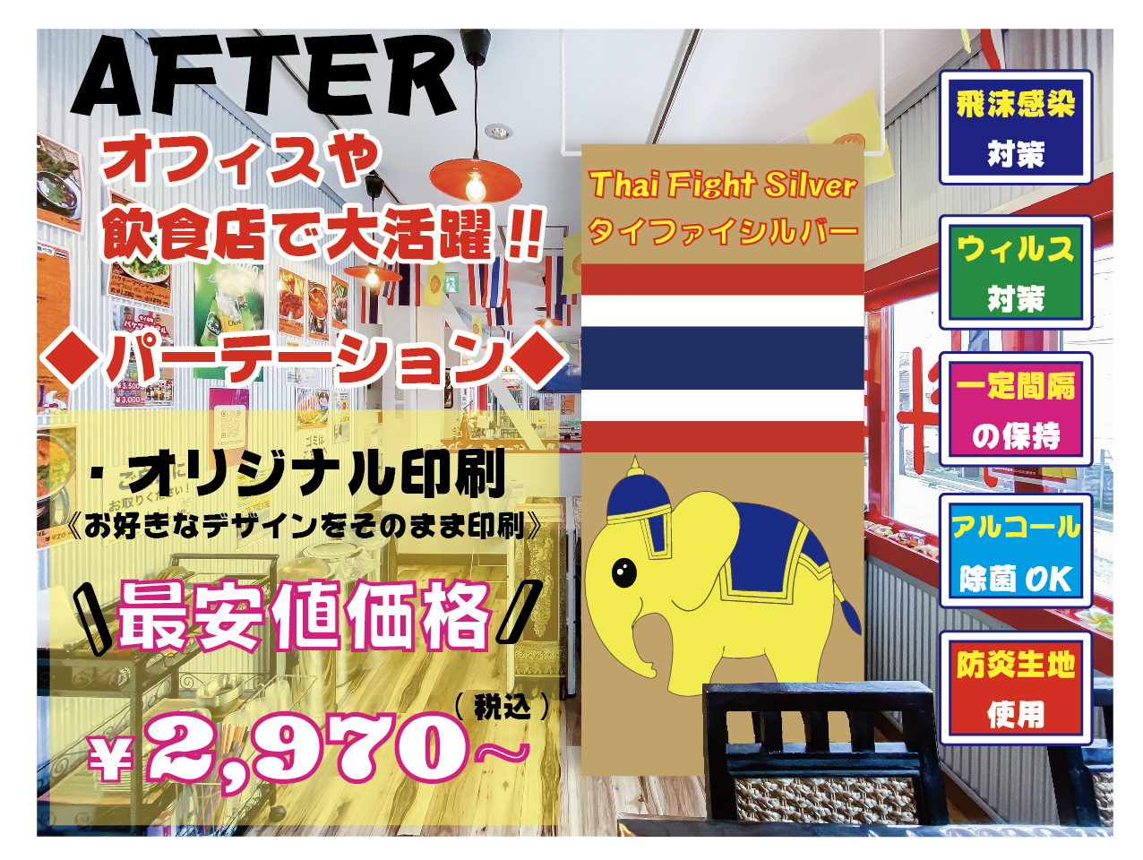 このタペストリーの生地であれば、拭き掃除もでき、天井から吊り下げ式なので飛沫も140センチの高さは余裕でクリア。防炎など機能がプラスされお好きなデザインも印刷できます。例えば好きなキャラクターや景色でもいいと思います。店内社内を簡易的に明るくデザインするのではないでしょうか。