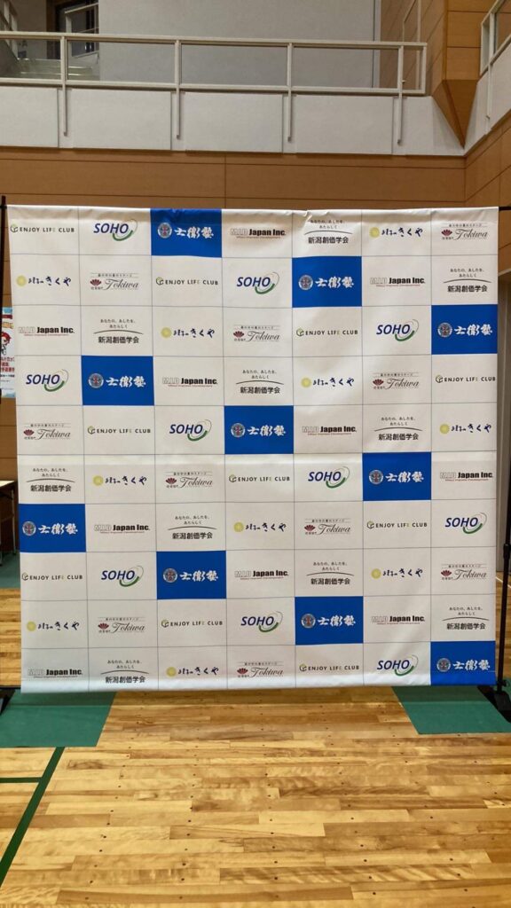 今回は地元新潟で3年ぶりに開催された2022J-1朱鷺CUP空手道選手権大会のインタビュー幕を、サイズ縦2400横2400のサイズでトロマットという軽量な布素材を四辺縫製して破れにくくしっかり製作しました。