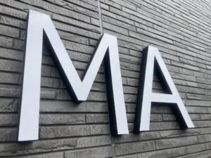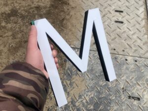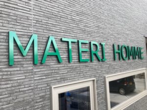 ヘアサロンMATERI HOMME様の外壁に映える、発色の良い緑色のカルプ文字が完成しました。