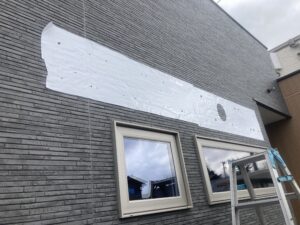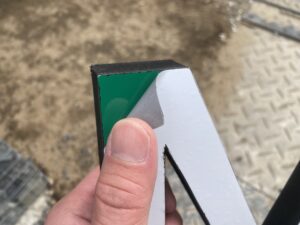 カルプ文字の施工では、保護シートを丁寧に剥がしながら仕上げ、落下やズレを防ぐために忍び返しのビスを一本打ちます。忍び返しとは目立たないカルプ文字の上にビスを打つ職人技、用語です。これにより、カルプ文字の接着時、ズレを防止しながら硬化させ、固定強化と長持ちを実現します。