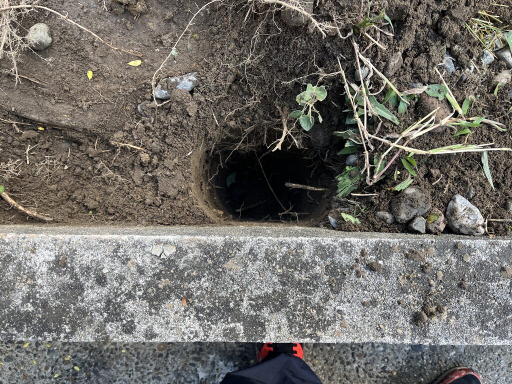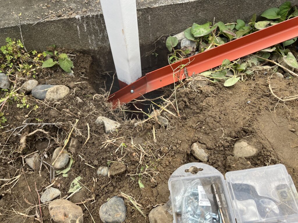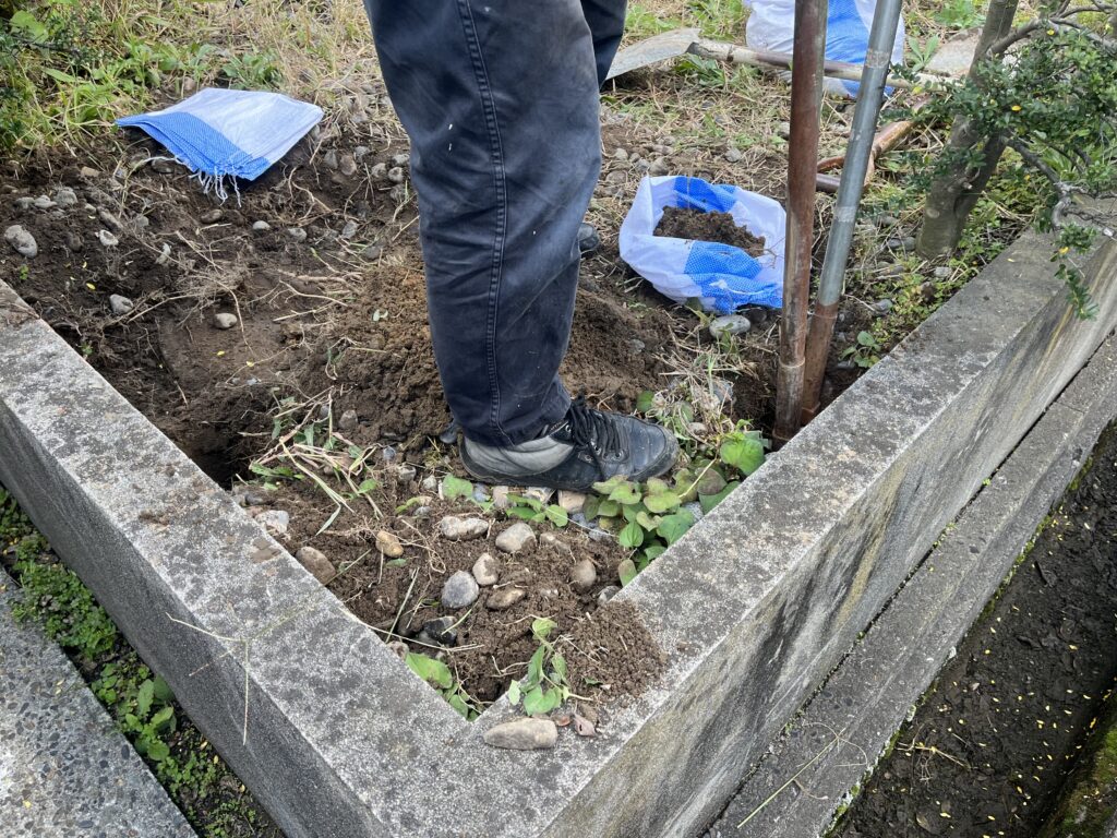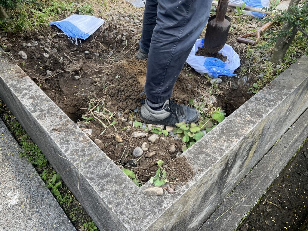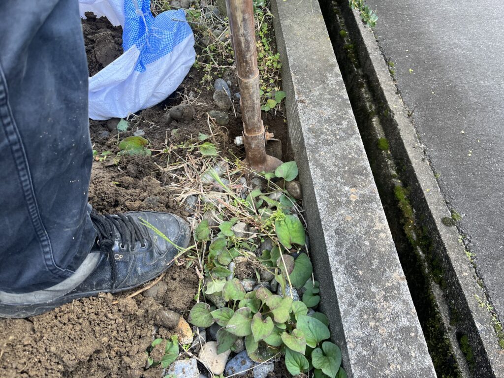 二本脚の小型の看板でもこうしてほじくると土や大きめな石ころやごみなどなかなかの量がでてきます。産廃業者に依頼して土以外の不用品はまとめて回収してもらえて、石やレンガブロックといった処理困難物の回収も依頼できます。