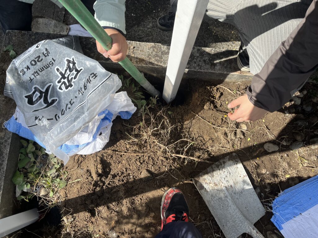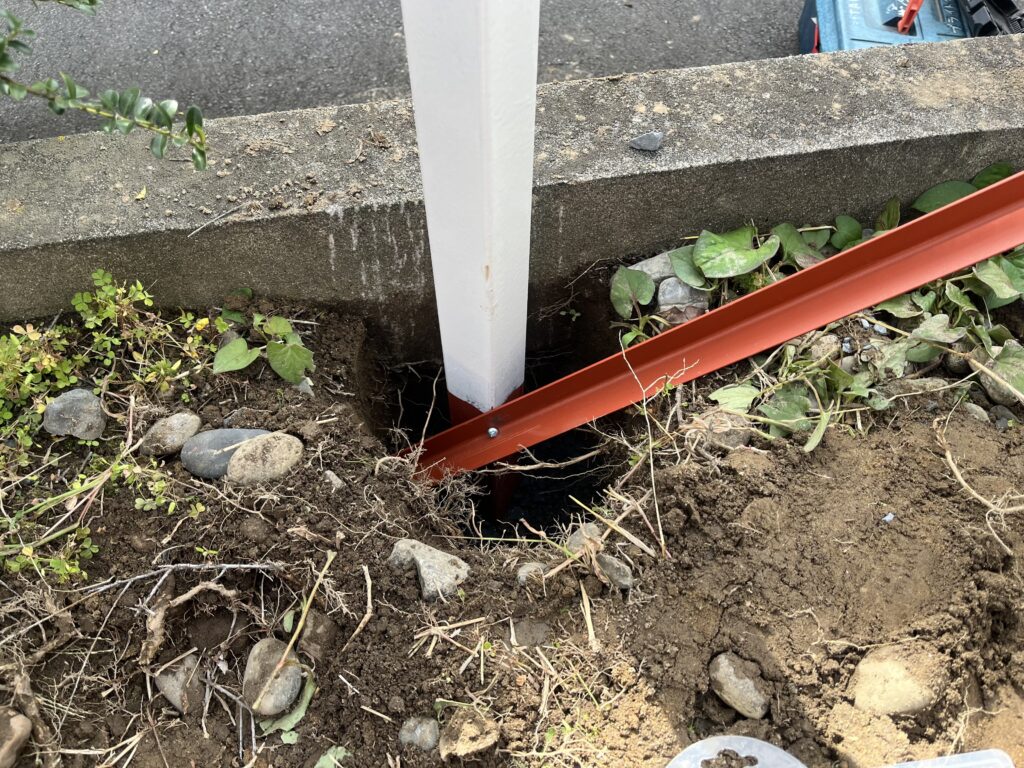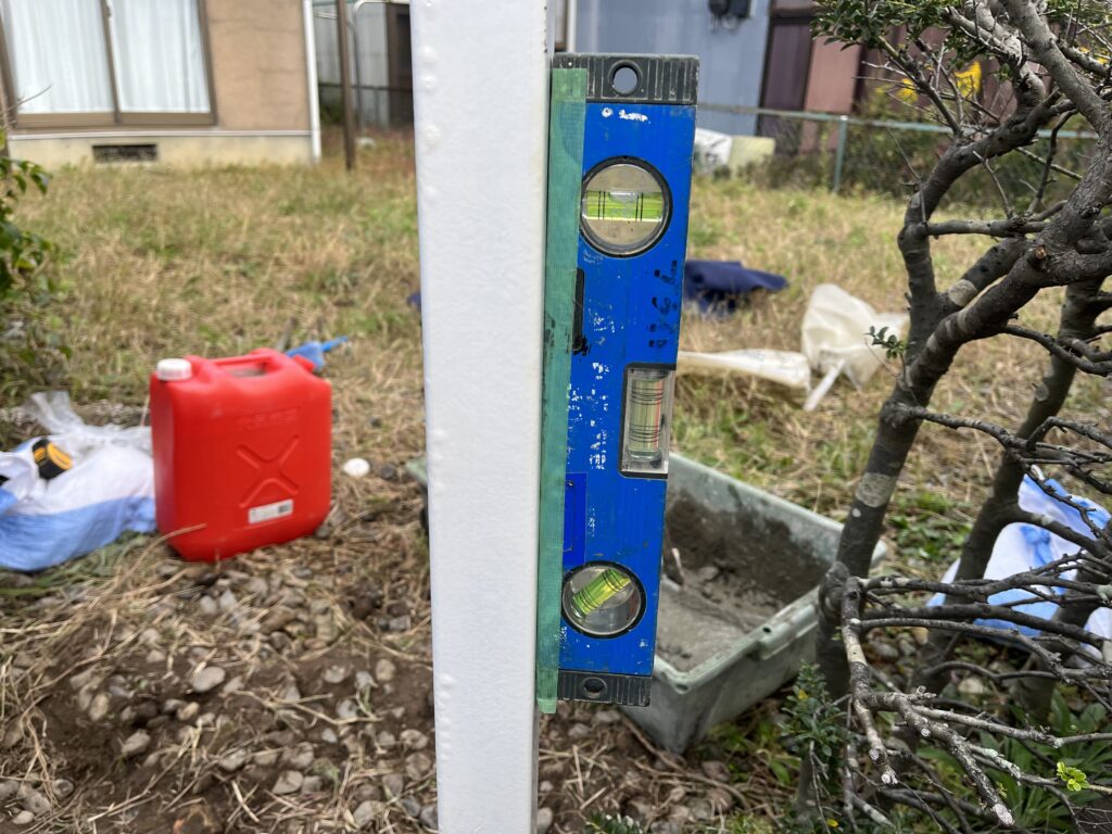 かんざしを土に差し込んで土台の強度保ち水平器を使って垂直にします。