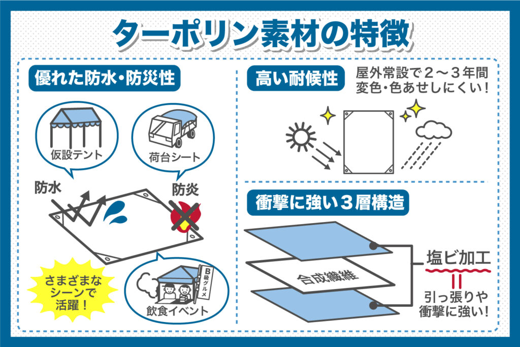 ターポリンの特長について、それぞれ詳しくご紹介しましょう。