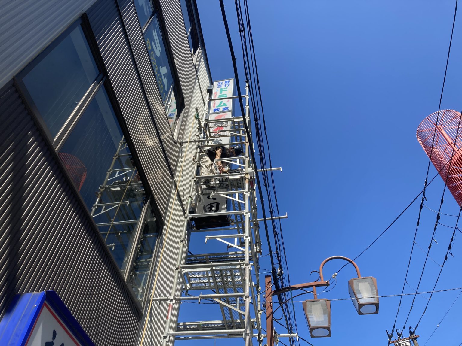 看板シート貼りが終わり足場をバラして終了です。