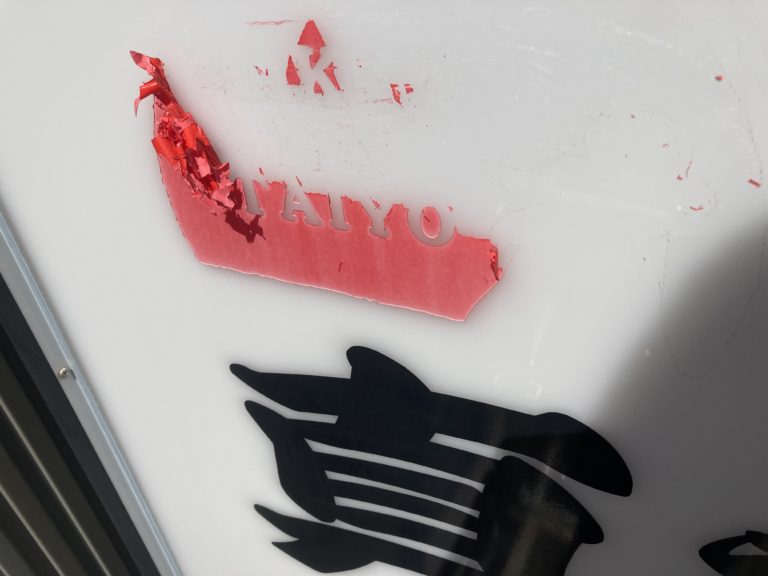 今回は上空でカッティングシートの剥ぎ作業で、両面の看板をスクレーパーで剥ぎ、洗浄液で洗い流します。