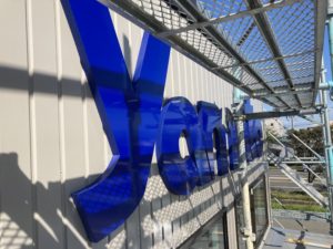 運搬時や荷上げ時カルプ文字に傷がつかないように白い保護フィルムが表面に貼ってありますが、剥ぐとこんなにも鮮やかな色合いで本当に美しいし広告認知度も向上。