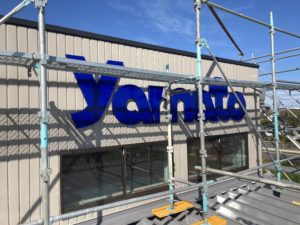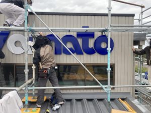 工場に立体感のあるカルプ文字看板の取付