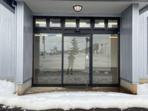 ガラス窓中央は看板の役割をし視認性を高め両サイドの2枚はすりガラスシートを貼ります。